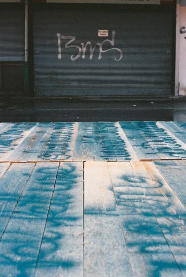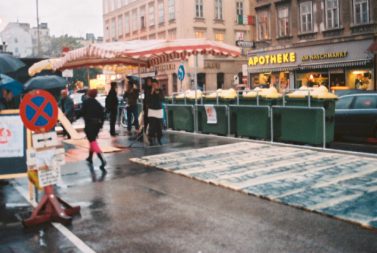 die Künstlerin einen Text auf 63 Gerüstbretter, die auf den Boden des Naschmarktes ausgelegt werden.